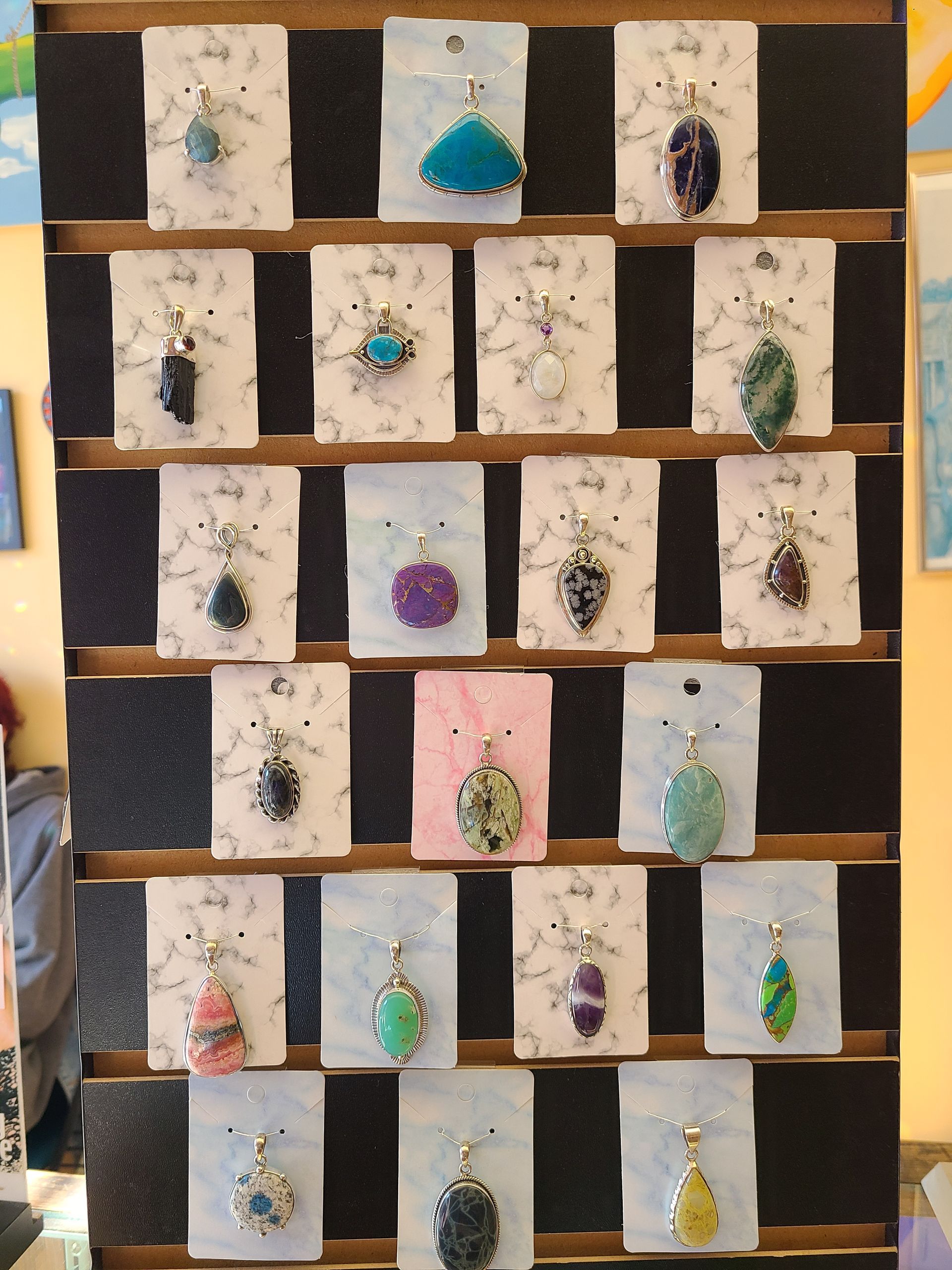 From Amethyst to Zoisite we carry a large variety of gemstone rings, pendants and earrings all set in beautiful sterling silver. Come check out our extensive selection of powerstone bracelets to show off you unique personality. If you prefer simpler pieces we also have many sterling silver rings, pendants and stud earrings with out stones.